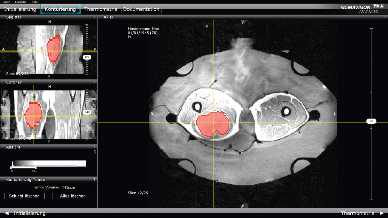SIGMAVISION ADVANCED erfasst alle Daten und Einstellungen der MR Thermometrie: von den Patientendaten über die Konturierung des Tumors bis hin zum Applikator-Typ und der grafischen Auswertung der Temperaturmessung. Alle Parameter lassen sich speichern und formatiert ausdrucken.