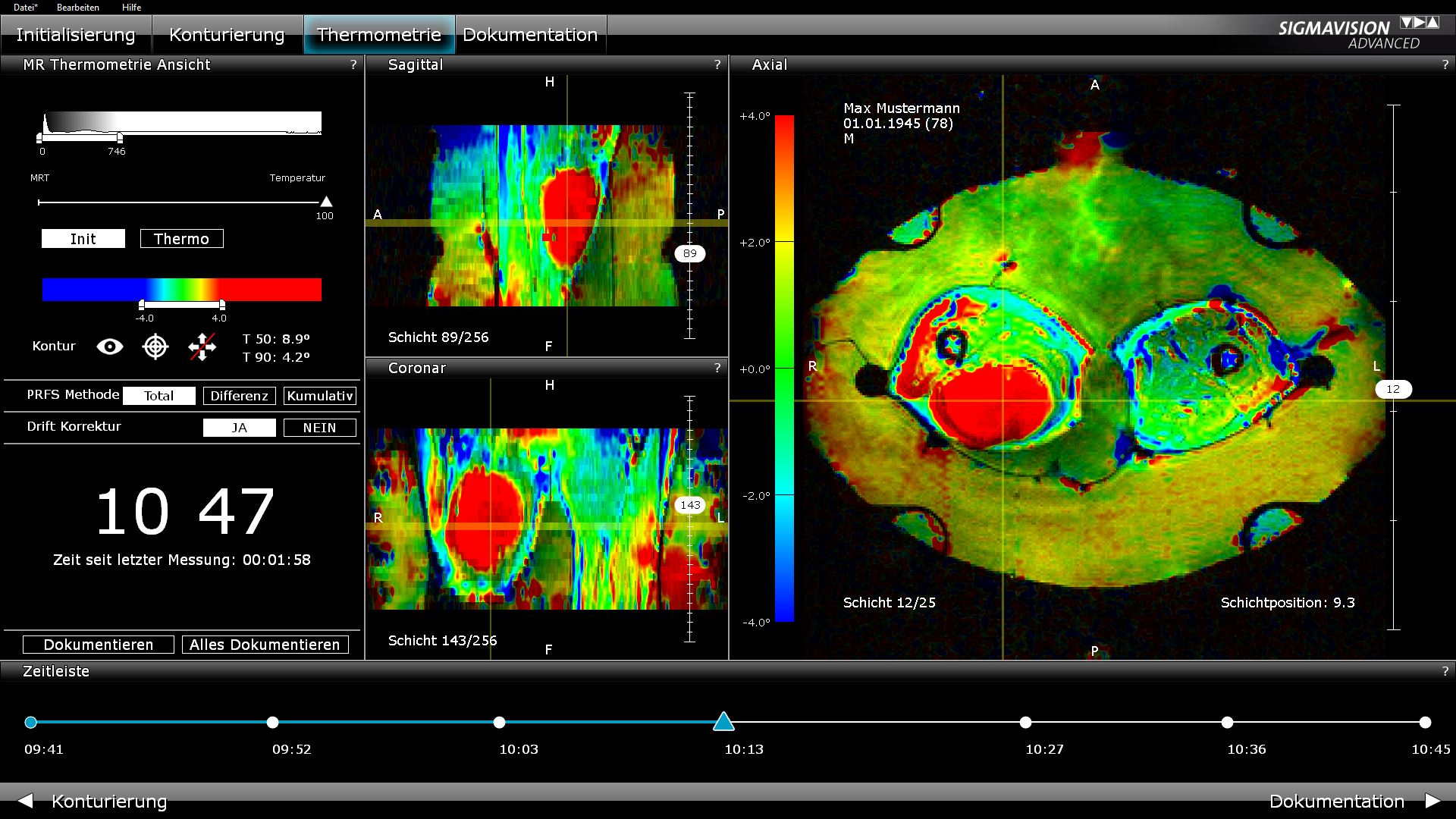 Während der Therapie erfasst die MR-bildgesteuerte Hyperthermie in regelmässigen Zeitabständen – z. B. alle 5 Minuten – einen neuen MR-Volumensatz, und farbcodierte Bereiche stellen auf den resultierenden Axialbildern das errechnete Temperaturbild dar. Dabei kann auch der zeitliche Verlauf der Temperaturveränderungen im Tumor und Muskelgewebe über eine Zeitleiste nachvollzogen werden. Der Anwender kann während der Behandlung auf unerwartete und nicht gewünschte Erwärmungen (Hotspots) reagieren.